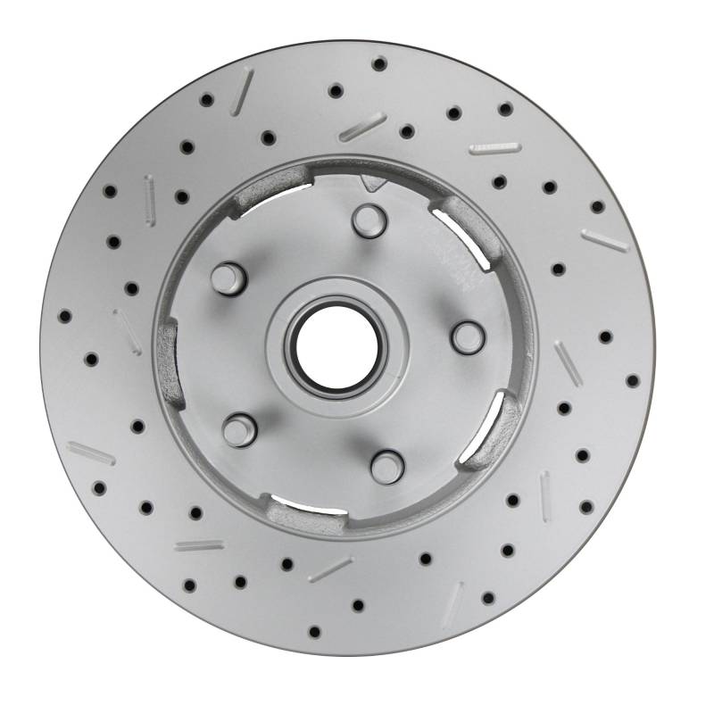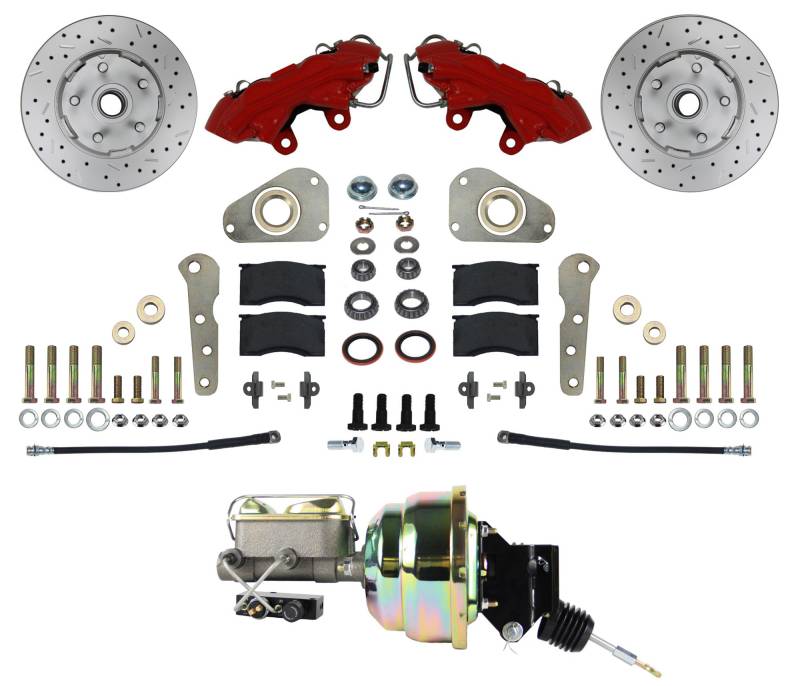 Power Front Kit with Drilled Rotors and Red Powder Coated Calipers Add the safety, reliability and performance of disc brakes to your vehicle with our Power drum to Power disc conversion with MaxGrip XDS rotors. In this Ford brake conversion kit you receive everything you need to mount red powder coated factory style 4 piston disc brakes to the original drum brake spindles currently on your vehicle. This brake conversion kit for Fords is a direct bolt on with NO cutting, drilling or welding required. This kit is for cars witha factory power brake booster and includes a new replacment power booster. For manual brake cars see kit FC0025-8307. All components used in these kits are new high quality, precision machined products. A great kit with a factory look and easy installation! Bolts directly to factory drum brake spindles Includes 4-Piston calipers and 11-1/4" rotors