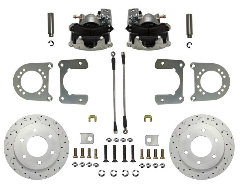 Rear Disc Brake Kit with Drilled Rotors and Zinc Plated Calipers Add the safety, reliability and performance of rear disc brakes to your 6-lug C10 or K10 with our GM 12 Bolt Rear End Disc Brake Conversion Kit. In this kit you receive everything you need to mount single piston disc brakes to your GM 12 Bolt Rear Axle. All components used in these kits are new high quality, precision machined products with a zinc plated finish to reduce corrosion and extend the life of your brake system. The heavy duty parking brake caliper will allow you to use your stock parking brake cables to actuate your parking brake. Includes single piston calipers with built in parking brake Includes 11-5/8" rotors