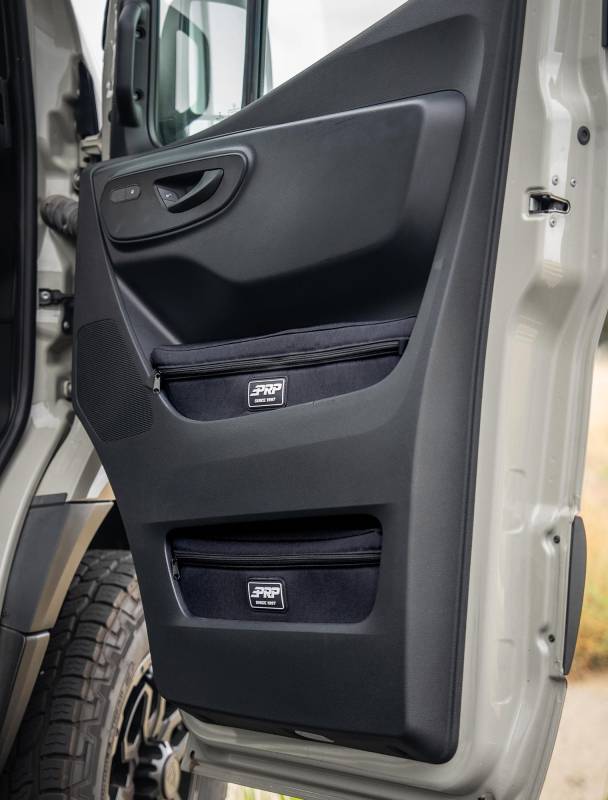 Upper Door Bags for 2019+ Mercedes Sprinter Van (Pair) PRP’s Upper Door Bags for the Mercedes Sprinter Van provides much needed storage, in a spot that’s quick and easy to access. The bag is designed to fit into the upper pockets on the front doors of your Sprinter Van. Each bag has a medium sized compartment that allows you to store more items in the door, while still being easy to access while driving. Perfect for sunglasses, snacks, clothing, tools, spare rags, water bottles, and anything else you may need! Constructed with durable, puncture resistant, and water resistant cordura material and rubberized zippers to prevent noise while you drive. Sold as a Pair (Driver and Passenger sides) Fits 2019+ Mercedes Sprinter Van (VS30)