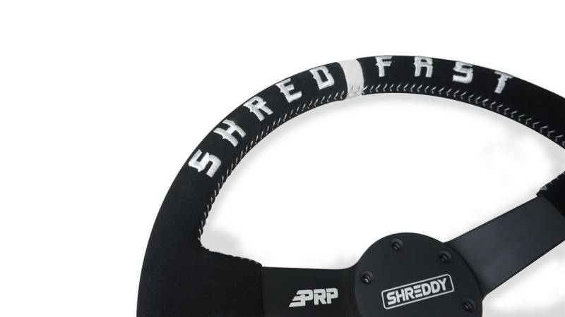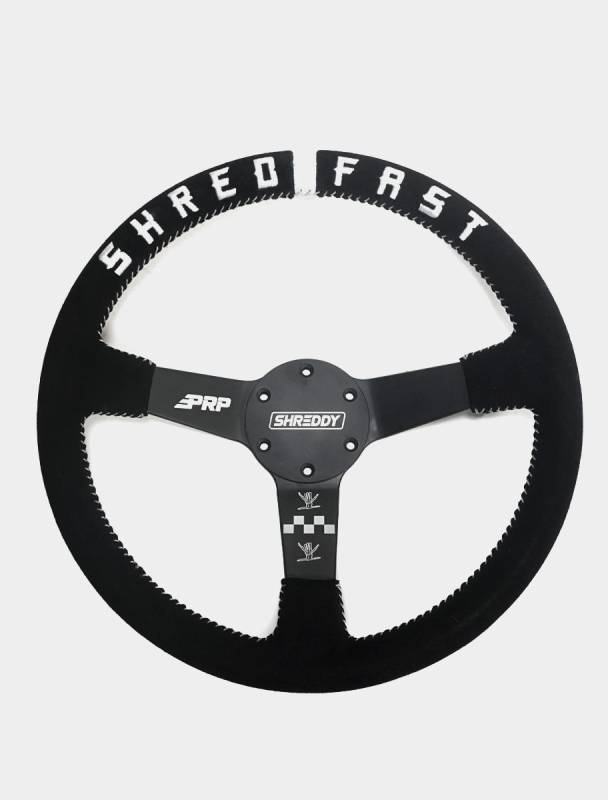 PRP X Shreddy Shred Fast Steering Wheel, Deep Dish Shred Hard and Shred Fast with this Limited Edition PRP X Shreddy Lyfe Collab Wheel. This Deep Dish Steering Wheel features a black suede band for superior grip, Shred Fast embroidered across the top, and the checkered flag on the bottom spoke. These are very limited, so don't hesitate! Get'em now! PRP’s Steering Wheels are Built for Off-Road. Constructed from high-strength aluminum for extra durability. The steering wheel has 6 point bolt pattern, specifically chosen because it fits the majority of aftermarket quick releases. 10/10 will make you shred more. Make sure to pair it up with our entire line of Shreddy x PRP Seats, Storage Bags, and Harnesses. FEATURES Made from high-strength aluminum 6 Point Bolt Pattern – Most common in off-road industry quick release adapters. Durable, moisture-resistant Black Suede and White Stitching Shred Fast Embroidered across the top Includes hub bolts MEASUREMENTS: Diameter – 13 inches Depth - 3 inches (Deep Dish) Weight – 2 lbs