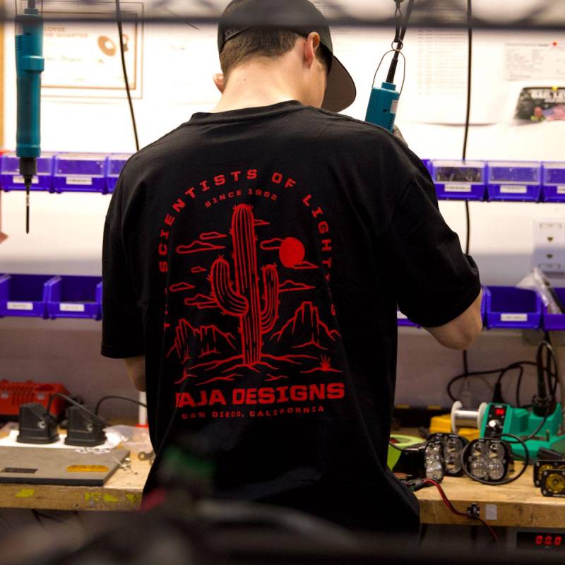 Baja Designs Shop Tee Shirt The Baja Designs Shop T-Shirt: Where iconic style meets a nod to our desert racing heritage. With the legendary Baja Designs logo on the front and a tribute to our pioneering spirit on the back, this relaxed fit tee is a must-have for enthusiasts and adventurers alike. Embrace the legacy of lighting innovation and desert racing with every wear.