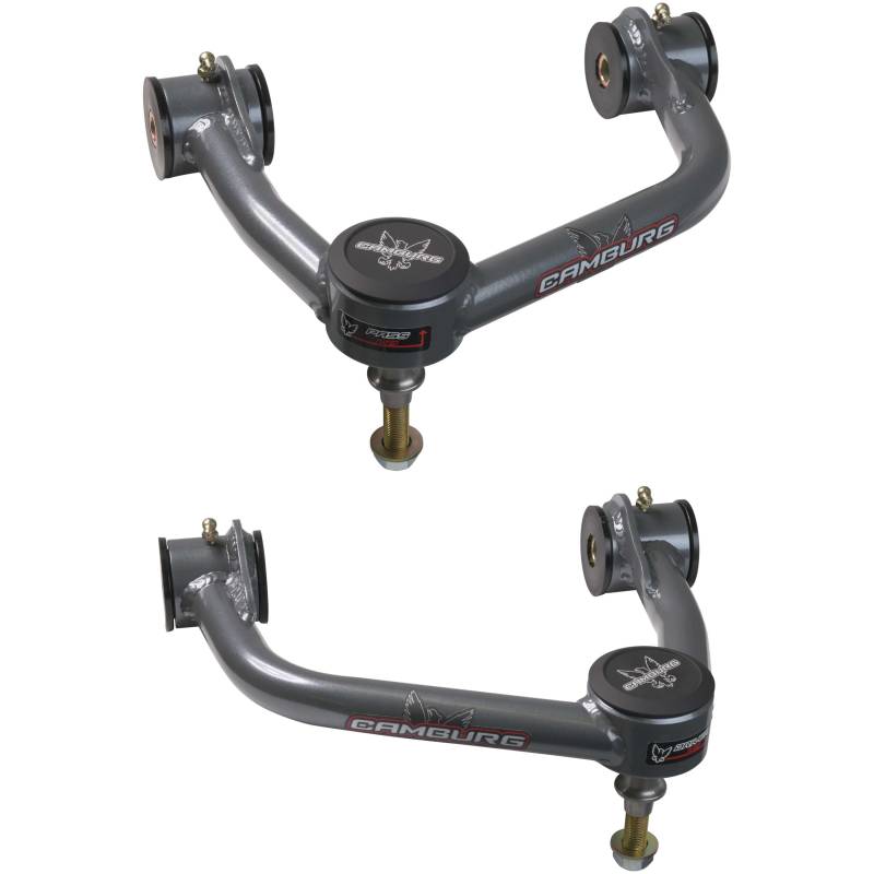 1.25" Performance Uniball Upper Arms (w/ covers) Our Camburg upper arms are designed to address the limitations of stock upper arms when lifting your truck. By replacing the stock ball-joint with a larger 1.25 uni-ball bearing, we improve wheel travel and durability under extreme conditions. We also incorporate a billet aluminum cover to protect the uniball from dirt and contaminants. Our arms are designed using CAD/CAM engineering software and manufactured in-house with precision welding and machining. They come with polyurethane frame pivot bushings, FK 1.25" PTFE-lined uniballs, and all necessary hardware for installation. These arms are compatible with lifts of 1-3" and correct camber and caster. Eliminates weak factory ball-joints Increases usable wheel travel Corrects camber and caster