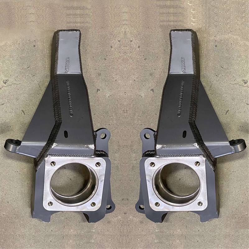 Performance Spindle Kit Introducing our Camburg performance spindles, the strongest stock replacement spindles/knuckles on the market. Designed to work with our long-travel kit and stock length lower arms, these spindles offer enhanced strength and craftsmanship. We have leveraged our 13+ years of experience with the stock design and custom versions for the military to create a superior product. Our spindles feature improved geometry and increased durability, along with a relocated ABS speed sensor for off-road protection. Compatible with both 4WD and RWD models, these spindles require no modifications and maintain the factory specifications in terms of lift and width. Using advanced Faro scanning technology and SolidWorks CAD/CAM modeling, we manufacture these spindles in-house for precise control. Starting with steel billets, we heavily CNC machine them for weight reduction and precision, followed by MIG welding of laser-cut plates. The spindles are then sandblasted and powder coated textured black for a durable finish. They come ready to install with all necessary hardware, including stronger stainless braided Kevlar reinforced front brake lines. For 2016+ models, drilling out the brake caliper bolt holes to 9/16" is required due to larger metric bolts. We recommend replacing the inner hub seal on older or higher mileage 4WD vehicles. Please note that these spindles are designed as OEM replacements and are not compatible with drop-down bracket lift kits. CNC machined and welded Bolt-on installation Strongest available