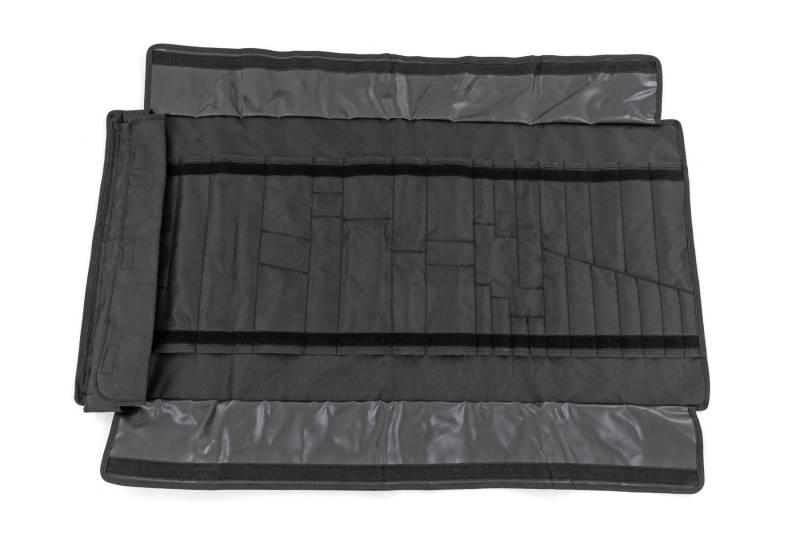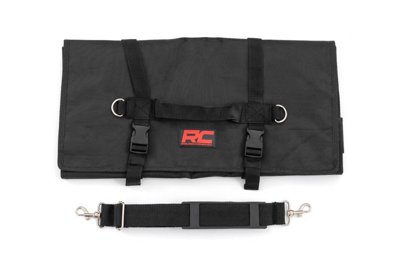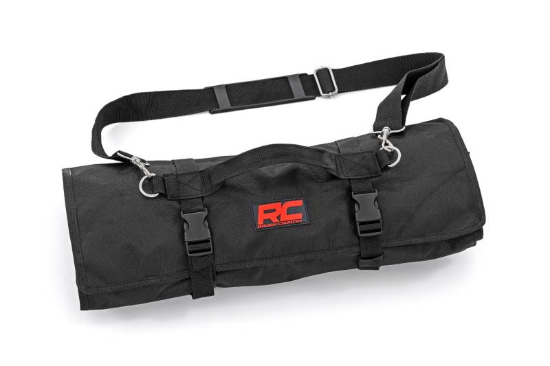Tired of digging through a cluttered toolbox to find the right tool? Rough Country's Roll-Up Tool Bag is designed to keep your tools organized, secure, and within reach, so you can spend less time searching and more time conquering the trails.Massive Storage: With 35 individual slots, you'll have plenty of room for everything from hammers to Allen wrenches. Plus, the dedicated socket pocket ensures your sockets are always organized and ready to go.Dead Silence: No more rattling tools driving you crazy. The Velcro closures on top, bottom, and socket pocket keep your tools securely in place, so you can focus on the ride.Easy Roll-Up and Go: Need to pack it up quickly? The quick-snap buckles and cinch-tight straps make it a breeze to roll up and secure your tools.Built to Last: Crafted from water-resistant nylon oxford material, this tool bag is built to wit'stand the toughest conditions and keep your tools protected.Easy Carry: The comfortable grip handle and strong X-stitched shoulder strap make it easy to carry your tools, no matter where your adventure takes you.This tool bag is ready to go wherever you are. Whether you're tightening things up or making trail-side repairs, having your tools organized and in reach means less hassle and more adventure.