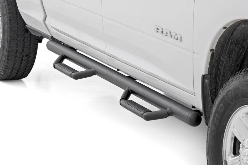 Climbing into your truck should never feel like a workout. With Rough Country's all-new bolt-on Nerf Steps, getting in and out is a breeze. Experience effortless access and elevate your truck with a sleek, durable upgrade.Enhanced Undercarriage Protection: Say goodbye to road debris, rocks, and obstacles that could damage your undercarriage. Our Nerf Steps act as a shield, protecting your vehicle from the harsh elements below.Integrated Stone Guards for Added Protection: Keep your Ram looking like new. The built-in stone guards effectively deflect kicked-up rocks and debris, preserving your vehicle's paint job from potential damage.Sleek, Streamlined Design: No bulky bars here, just a clean, high and tight profile that follows your cab's contours. These Nerf Steps provide a polished, streamlined look that enhances your truck's rugged yet refined style.Built to Endure: Crafted from .084 wall, corrosion-resistant tubing, these Nerf Steps are engineered to withstand anything the road or trail throws at them. From muddy trails to harsh environments, they'll handle it all while staying tough and reliable.Quick and Easy Installation: No drilling required, just bolt them on and enjoy a hassle-free installation. Spend less time working and more time exploring with this straightforward, user-friendly design.Limited Lifetime Warranty: Backed by Rough Country's Limited Lifetime Warranty, these Nerf Steps provide lasting durability and peace of mind for years to come.Step up your truck's style and protection with Rough Country Nerf Steps. Easy installation, superior defense, and a sleek, high-end design, everything you need to take your vehicle to the next level.