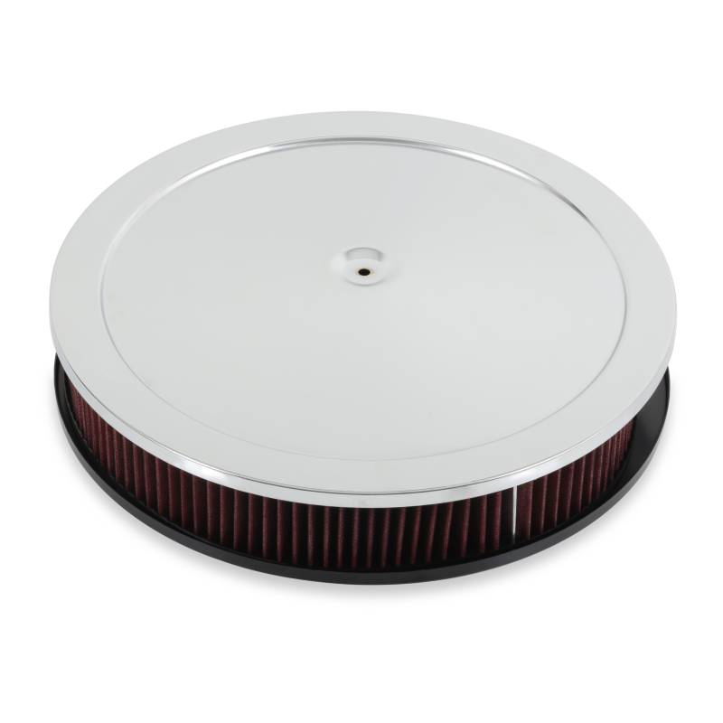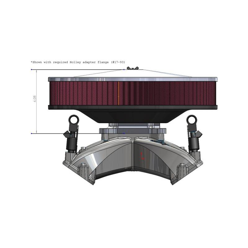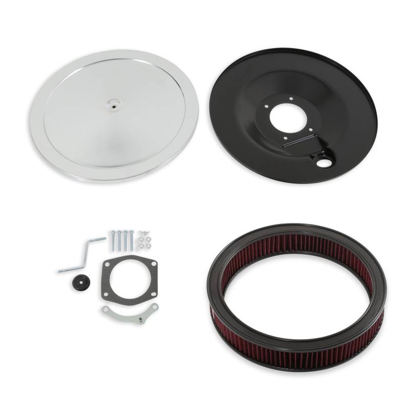 RetroFilter air cleaners cleverly hide an LS drive-by-wire throttle body inside to maintain a low height and classic looks. Utilizing a hidden opening in the base to hide unsightly wiring from the throttle body, this trick air cleaner allows you to experience all the benefits of modern technology and keep the vintage look you want. Pair with any Holley intake manifold with a 4150/4160 square bore flange for maximum aesthetics and performance.\nThe opening is 92mm but any 4-bolt pattern LS throttle body will physically fit. We recommend the LS2/LS3/LS7 style but the L33, L76, and L92 should also fit.\n*Requires adapter to connect to 4150/4160 square bore flange style manifold - Holley EFI part # 17-93 is recommended.\nAll part numbers in this series:\n120-500 - 16-Inch DBW Air Cleaner - Chrome\n120-501 - 16-Inch DBW Air Cleaner - Black\n120-520 - 14-Inch Dual Snorkel DBW Air Cleaner - Chrome\n120-521 - 14-Inch Dual Snorkel DBW Air Cleaner - Black