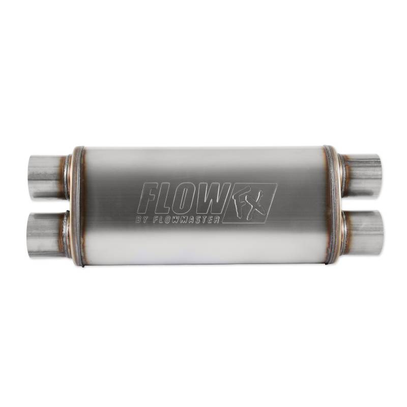 Flowmaster's Flow FX series mufflers deliver a moderate performance tone for the enthusiast looking for an exhaust note that is different from the "chambered" muffler sound. With a dual 3.00-inch inlet and outlet size, this muffler is a great choice for large displacement gas engines. The interior features a large 3.00-inch "straight-through" X-pipe style stainless steel perforated core, surrounded with high-temperature sound absorption materials delivering a deep traditional mellow tone. The internal flow design is reversible, so the muffler can be installed in either direction to best suit the vehicle application. Features include fully MIG-welded "bright" 409 stainless steel construction with the Flow FX logo embossed on both sides of the case. The Flow FX line of mufflers are perfect for the person looking for a show quality performance muffler at an economical price point and in a compact sized case.
