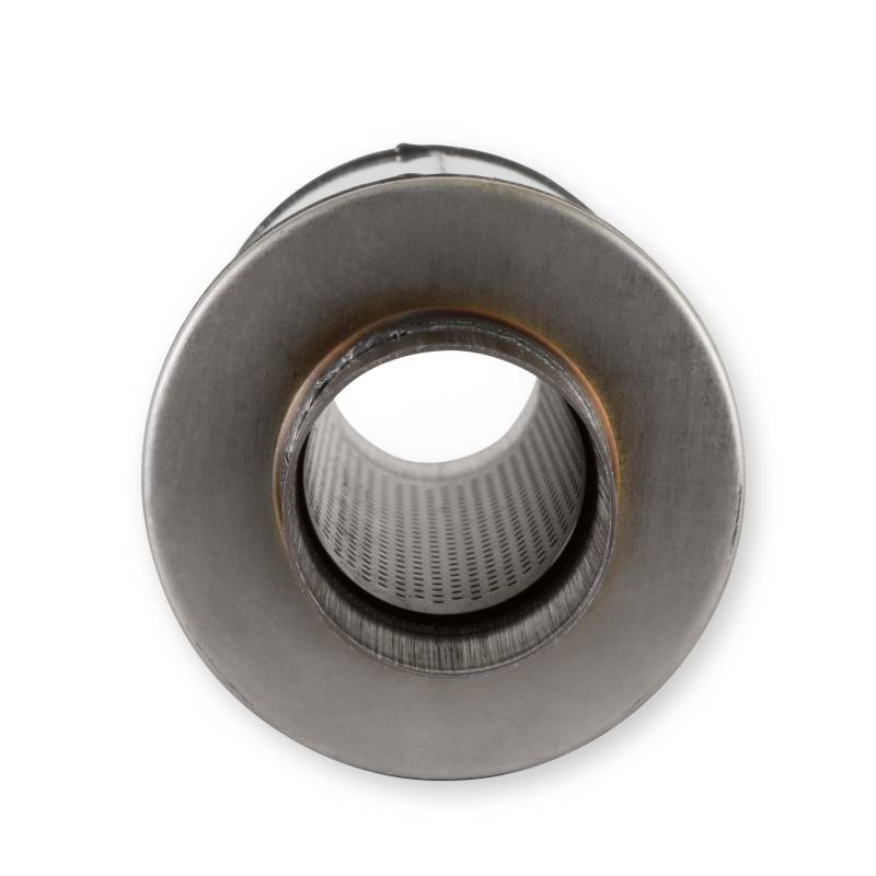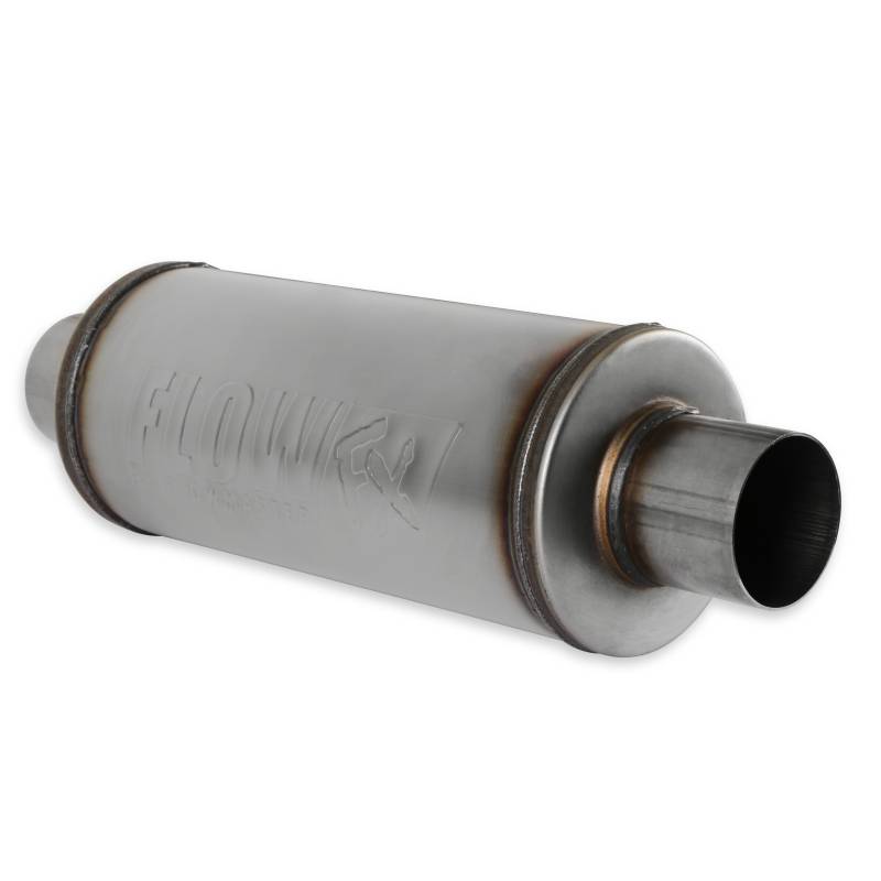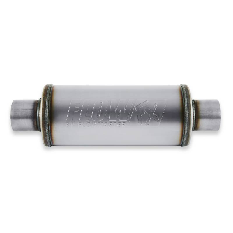 Flowmaster's Flow FX series mufflers deliver a moderate performance tone for the enthusiast looking for an exhaust note that is different from the "chambered" muffler sound. With a 3.0-inch inlet and outlet size and a 6-inch diameter body, this muffler is a great choice for large displacement gas engines. The interior features a large 3.0-inch "straight-through" stainless steel perforated core, surrounded with high-temperature sound absorption materials delivering a deep traditional mellow tone. The internal flow design is reversible, so the muffler can be installed in either direction to best suit the vehicle application. Features include fully MIG-welded "bright" 409 stainless steel construction with the Flow FX logo embossed on both sides of the case. The Flow FX line of mufflers are perfect for the person looking for a show quality performance muffler at an economical price point and in a compact sized case.