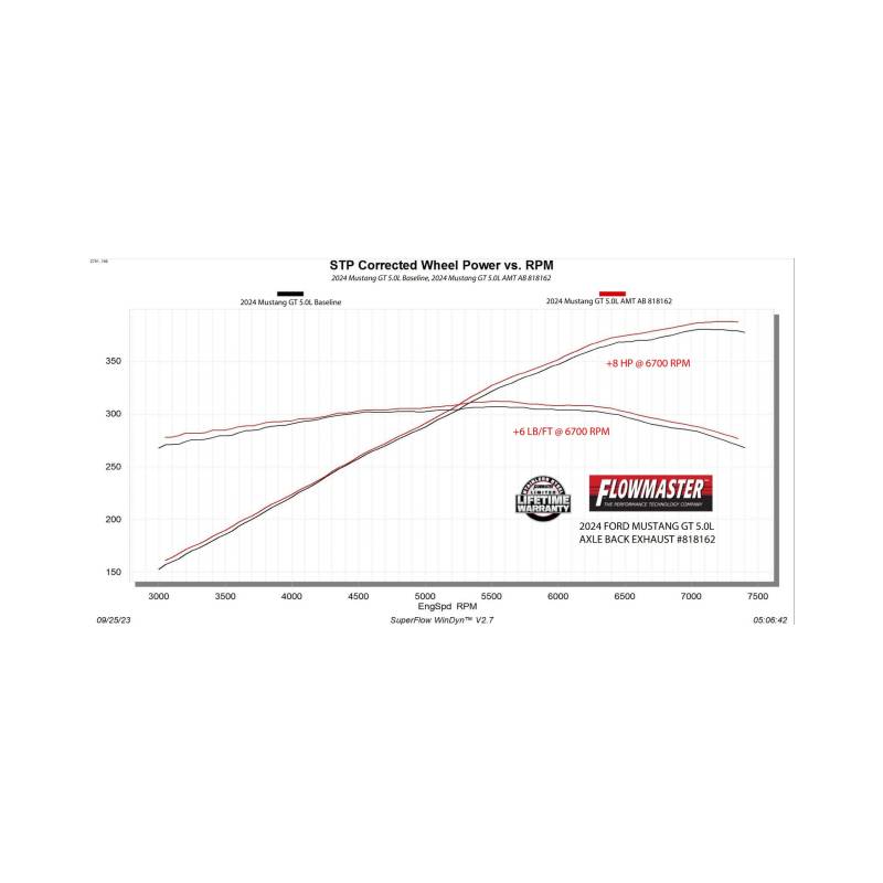 Flowmaster introduces our American Thunder axle-back exhaust system for the 2024-2026 Ford Mustang GT with the 5.0-liter engine or the EcoBoost 2.3L engine and the standard factory non-valved exhaust system. This system uses the Super 44 series mufflers for an aggressive exhaust tone and increased performance. Maximum dyno gains of up to 8 hp and 6 lb-ft were measured at the rear wheels. 3.00-inch mandrel bent 409 stainless steel tubing is used to maximize exhaust flow and durability. Dual 4.00-inch polished stainless steel tips are used to add a custom look to this iconic vehicle. All the necessary hardware is included and factory mounting locations are used for an easy installation. Fits both coupes and convertibles. Backed by Flowmaster's Lifetime Limited Warranty.