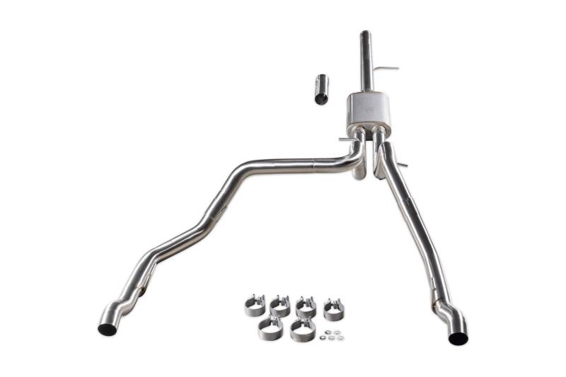 Flowmaster's® Signature Series Cat-back exhaust system is designed for the 2019*-2026 GM Silverado/Sierra 1500 trucks (*new body style) with 5.3L engine and factory dual exhaust. This bolt-on system is manufactured using premium brushed 304 stainless steel throughout and features a 3.00-inch inlet pipe leading to a single inlet/dual outlet Signature Series straight-through muffler for a deep, moderately aggressive sound and maximum performance. This premium exhaust system is TIG welded for a stronger, more precise weld that looks as good as this system sounds. Maximum dyno gains of 21 hp and 26 lb.ft at the rear wheels. The dual 2.50-inch mandrel bent tailpipes are custom routed to clear the factory spare tire and tow hitch without any clearance issues and exit out through the factory exhaust bezels in the bumper, retaining the factory dual exhaust appearance. This system utilizes factory hanger locations, includes installation instructions, and all necessary hardware for an easy at home installation. Note: Fits 2WD and 4WD models.