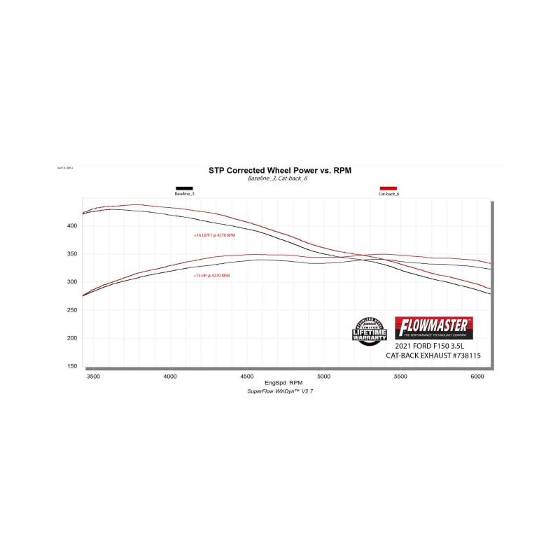 Flowmaster's® Signature Series Cat-back exhaust system for the 2021-2026 Ford F-150 trucks with the 2.7, 3.5, and 5.0-liter engines. This system uses a TIG welded 304 stainless steel Siganture Series muffler for an aggressive to moderate sound level and increased performance. 3.00-inch mandrel bent brushed 304 stainless steel tubing allows for maximum exhaust flow and durability, while maintaining a highend appearance. This premium exhaust system is TIG welded for a stronger, more precise weld that looks as good as this system sounds. This system use a larger 4.50-inch PVD coated black chrome tip for a custom look. Max dyno gains of 13 hp and 16 lb-ft at the rear wheels. All of the necessary hardware is included, and factory-mounting locations are used for an easy installation. Backed by Flowmaster's Lifetime Limited Warranty.