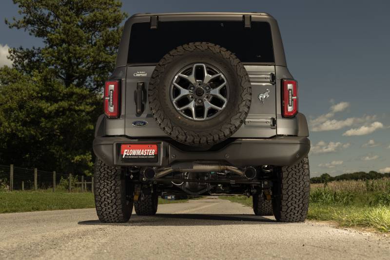 Flowmaster's® Signature Series Axle-back exhaust system for the 2021-2025 Ford Bronco with the 2.3 or 2.7-Liter engine. This system uses a TIG welded 304 stainless steel Signature Series style muffler for a deep exhaust tone with an aggressive to moderate sound level and increased performance. Maximum dyno gains of 17 hp and 18 lb-ft. were measured at the rear wheels. The system uses 3.00-inch mandrel bent brushed 304 stainless steel tubing to maximize exhaust flow and durability. This premium exhaust system is TIG welded for a stronger, more precise weld that looks as good as this system sounds. Dual 4.00-inch PVD coated black chrome tips are used to add a custom look to this iconic vehicle. All of the necessary hardware is included and factory mounting locations are used for an easy installation. Backed by Flowmaster's Lifetime Limited Warranty.