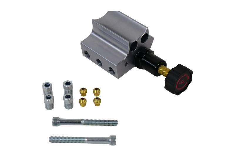 The Remaster specific adjustable proportioning valve is machined to mount directly under the Remaster for a clean, compact unit. The ReMaster valve is available in both left and right port configuration with in/out ports for the rear which the valve controls as well as a pass through for the front to make plumbing simple and clean. Just like the ReMaster master cylinder, this valve offers removable seats, and can be used with inverted flare fittings or straight banjo fittings. The valve includes 4) brass seats and 4) 3/8” x 24 tube nuts. Available in black, gray, or polished finishes and left or right port configuration to match the ReMaster.