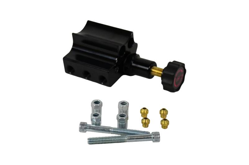 The Remaster specific adjustable proportioning valve is machined to mount directly under the Remaster for a clean, compact unit. The ReMaster valve is available in both left and right port configuration with in/out ports for the rear which the valve controls as well as a pass through for the front to make plumbing simple and clean. Just like the ReMaster master cylinder, this valve offers removable seats, and can be used with inverted flare fittings or straight banjo fittings. The valve includes 4) brass seats and 4) 3/8” x 24 tube nuts. Available in black, gray, or polished finishes and left or right port configuration to match the ReMaster.