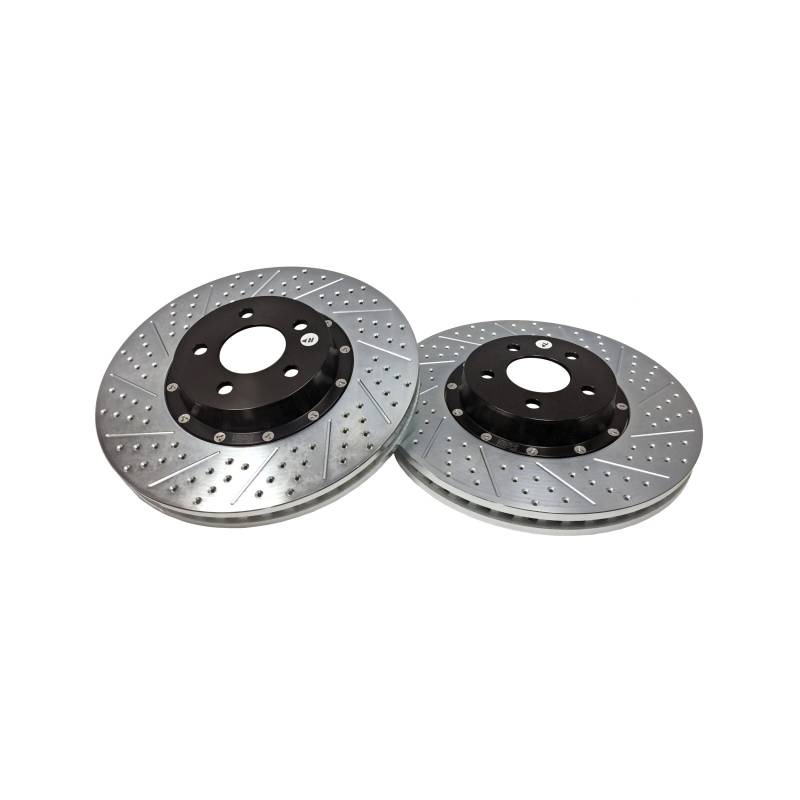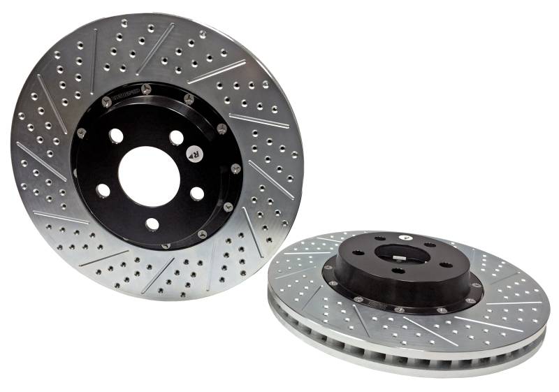 The Baer EradiSpeed+, 2-piece rotor upgrade features a premium, purpose-cast rotor mounted to a black anodized, 6061-T6 aluminum hat with NAS aircraft grade hardware. Eradispeed+ rotors are manufactured from quality iron materials with increased mass in the friction area and have a curved vane design designed providing greater air flow and improved heat dissipation to outperform the factory units they replace. Each Eradispeed+ is finished with a slot, drilled and zinc-plated finish for a pleasing cosmetic appearance. The EradiSpeed+ is a direct-bolt-on system with simple installation and no bleeding of the brakes.