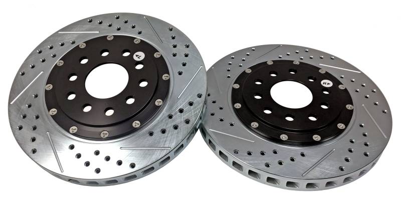 The Baer EradiSpeed+, 2-piece rotor upgrade features a premium, purpose-cast rotor mounted to a black anodized, 6061-T6 aluminum hat with NAS aircraft grade hardware. Eradispeed+ rotors are manufactured from quality iron materials with increased mass in the friction area and have a curved vane design designed to provide greater air flow and improved heat dissipation to outperform the factory units they replace. Each Eradispeed+ is finished with a slot, drilled and zinc-plated finish for a pleasing cosmetic appearance. The EradiSpeed+ is a direct-bolt-on system with simple installation and no bleeding of the brakes.