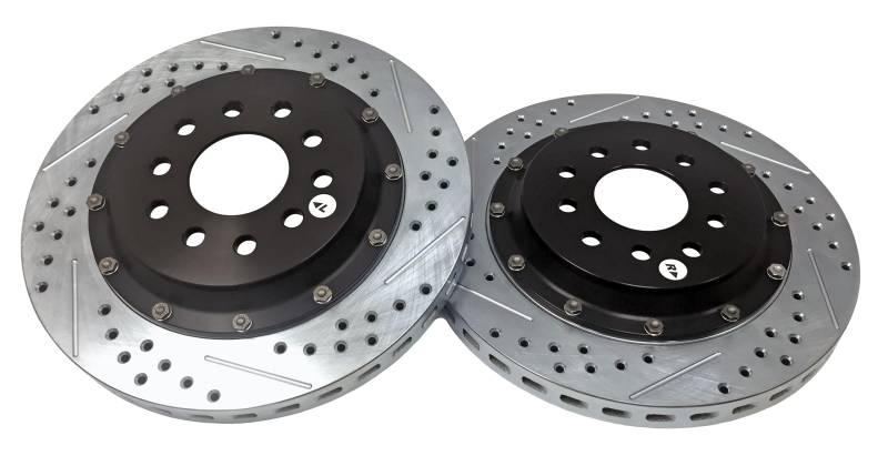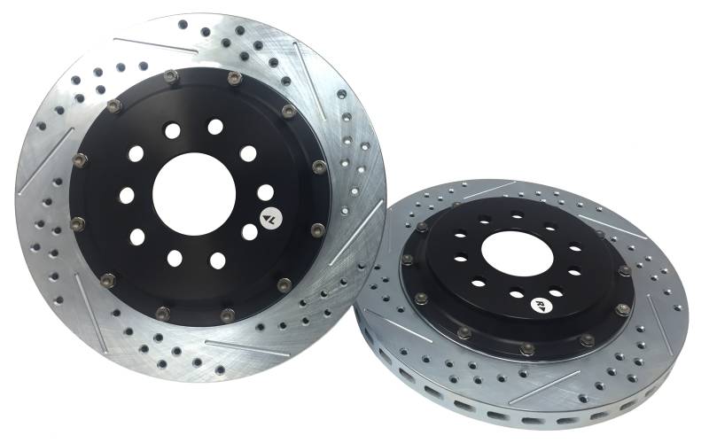 The Baer EradiSpeed+, 2-piece rotor upgrade features a premium, purpose-cast rotor mounted to a black anodized, 6061-T6 aluminum hat with NAS aircraft grade hardware. Eradispeed+ rotors are manufactured from quality iron materials with increased mass in the friction area and have a curved vane design designed to provide greater air flow and improved heat dissipation to outperform the factory units they replace. Each Eradispeed+ is finished with a slot, drilled and zinc-plated finish for a pleasing cosmetic appearance. The EradiSpeed+ is a direct-bolt-on system with simple installation and no bleeding of the brakes.
