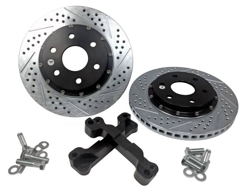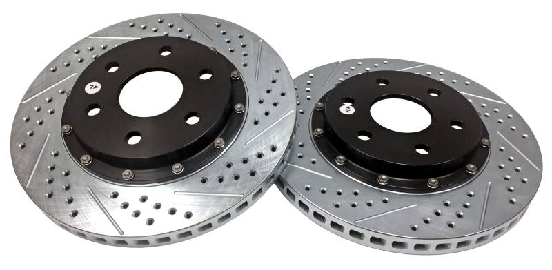 The Baer EradiSpeed+1, 2-piece rotor upgrade features a premium, larger diameter than stock, purpose-cast rotor mounted to a black anodized, 6061-T6 aluminum hat with NAS aircraft grade hardware. Eradispeed+ rotors are manufactured from quality iron materials with increased mass in the friction area and have a curved vane design designed to provide greater air flow and improved heat dissipation to outperform the factory units they replace. Each Eradispeed+ is finished with a slot, drilled and zinc-plated finish for a pleasing cosmetic appearance. Caliper anchor relocation brackets included to reposition the caliper on the larger than stock diameter rotor. The EradiSpeed+1 is a direct-bolt-on system with simple installation and no bleeding of the brakes.