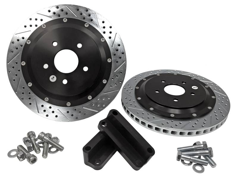 The Baer EradiSpeed+1, 2-piece rotor upgrade features a premium, larger diameter than stock, purpose-cast rotor mounted to a black anodized, 6061-T6 aluminum hat with NAS aircraft grade hardware. Eradispeed+ rotors are manufactured from quality iron materials with increased mass in the friction area and have a curved vane design designed to provide greater air flow and improved heat dissipation to outperform the factory units they replace. Each Eradispeed+ is finished with a slot, drilled and zinc-plated finish for a pleasing cosmetic appearance. Caliper anchor relocation brackets included to reposition the caliper on the larger than stock diameter rotor. The EradiSpeed+1 is a direct-bolt-on system with simple installation and no bleeding of the brakes.
