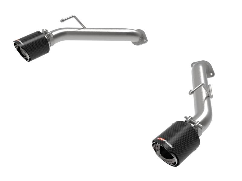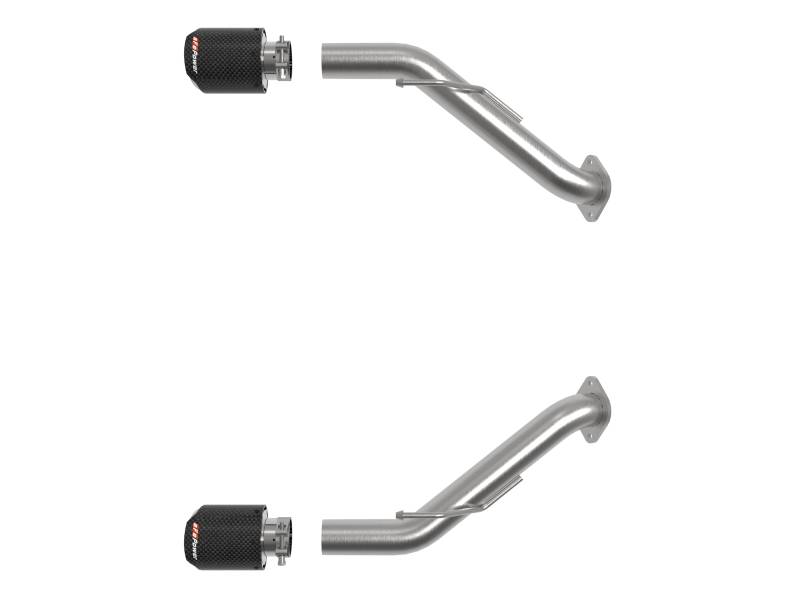 This axle-back exhaust system is constructed of 2-1/2 IN mandrel-bent brushed finished 304 stainless steel tubing for maximum strength and durability. Finishing off this exhaust system are dual 4-1/2 IN diameter carbon fiber stainless steel clamp-on exhaust tips. The tips features an aFe POWER logo for a unique style. This system produces an aggressive sound unleashing all available horsepower and torque. Utilizing factory style flanges and hangers this system is a direct bolt-on system, which requires no cutting or modifications for a hassle-free installation. State-of-the-art computer-aided design technology is utilized for precise vehicle fitment. 100% TIG-Welded for race-proven strength and durability.