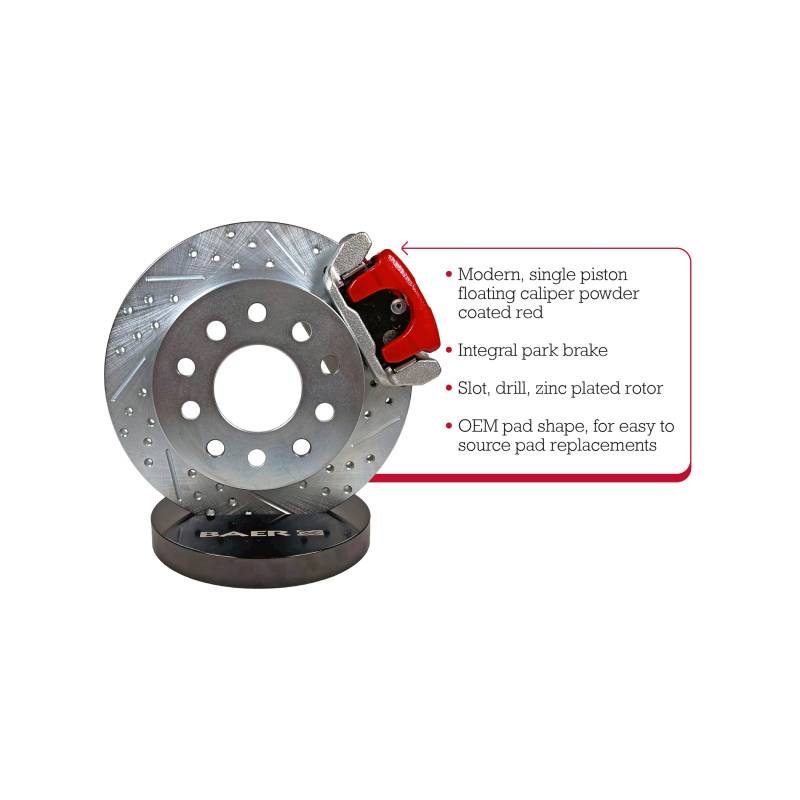 This Baer Classic system features a single piston, integral park brake caliper mounted to a 10.50", 1-piece slot, dimpled and zinc plated rotor. The caliper comes with a red powder coated finish, includes dust/weather seal and uses the popular D627 pad type. The system includes calipers, rotors, brackets, hardware, stainless braided brake hoses and fittings. The Baer Classic system is a cost effective, full feature drum to disc conversions and fits most 14" or larger wheels.