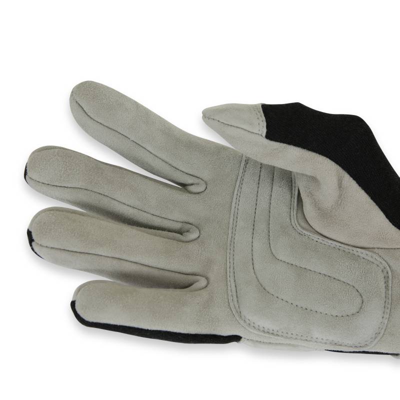 RaceQuip 351 Series auto racing gloves are a one layer Nomex® and suede leather glove built to SFI-1 specifications that provides a soft and supple feel. The grey suede leather palm adds a premium look and extra grip to this affordable SFI 3.3/1 rated driving glove. The knuckle pad and palm reinforcements attach to the Nomex® knit back in a way that promotes flexibility. Extra leather has been added between the index finger to the end of the thumb in the high-wear area. The 351 Series single layer Nomex(R) motorsports gloves feature a standard length gauntlet with an adjustable velcro(R) closure on the back to ensure a proper fit. These affordable Nomex(R) racing gloves are SFI 3.3/1 certified with SFI tags affixed to the wrist. Available in Black, Red, or Blue in sizes Small - X-Large.