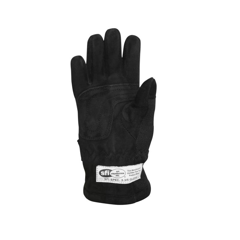 RaceQuip 355 Series Youth auto racing gloves are a soft double layer knit Nomex® SFI-5 rated glove. The high grip black suede reinforced leather palm gives this kids driving glove a unique look and feel. The knuckle pad and palm reinforcements attach to the Nomex® back in a way that promotes flexibility. Extra leather has been added between the index finger to the end of the thumb in the high-wear area. The 355 Series Youth two layer motorsports glove features a standard length gauntlet with an adjustable velcro(R) closure on the back to ensure a proper fit. These affordable multi layer Nomex(R) driving gloves are SFI 3.3/5 rated with SFI tags affixed at the wrist. Designed with the NHRA Jr. Dragster or Quarter Midget racer in mind. Available in Child sizes XXXS - Large in black.
