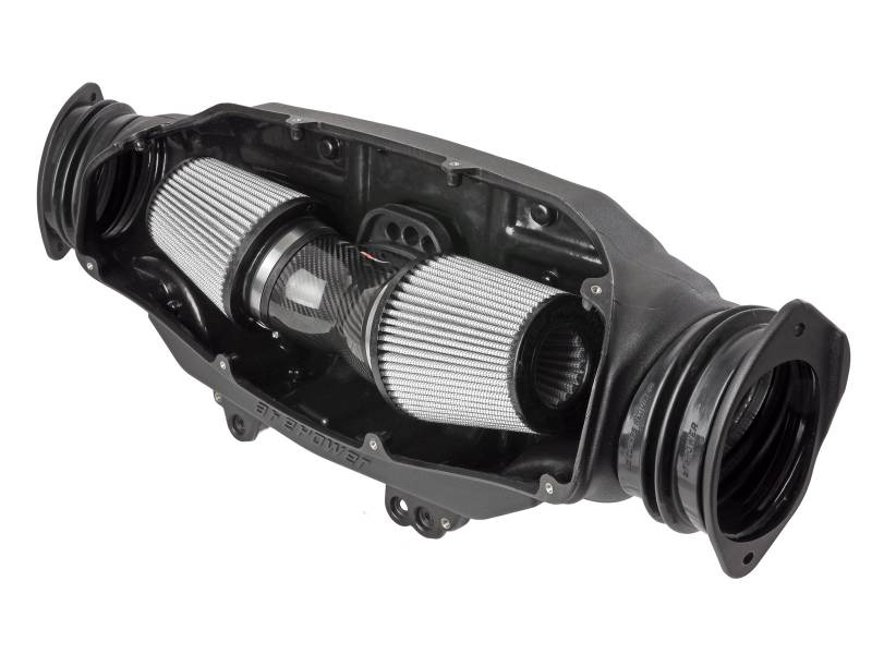 Dual 4” Flange 360-degree radial flow air filters feature our oil-free Pro DRY S media with three layers of synthetic media for maximum convenience. Their progressive layering provides great filtration efficiency and dust holding capacity, while not requiring the use of oils. This media is best suited for street use. Their inverted tops make for more filter surface area, resulting in longer service intervals. Lightweight twill weave carbon fiber tube directs the filtered air from the dual air filters to the engine. It is computer designed and dyno tested to increase air flow while reducing weight and enhancing the visual appearance of the engine bay. The tube is manufactured out of 100% carbon fiber material (No fiberglass). The dual air filters are surrounded by an open-element XLPE (cross-linked polyethylene) polymer housing that minimizes warm engine air for maximum performance. It is precisely designed and manufactured to fit perfectly into the factory mounting location. The housing connects to the factory air inlets on each side of the vehicle to capture the coolest air available. Silicone bellow couplings are used for engine movement and easy installation. This unique carbon fiber cover is also lightweight high gloss clear-coated twill weave carbon fiber and closes off the housing from unwanted hot engine air. It features a Black Series emblem for authenticity and is secured to the housing using aFe POWER laser etched washers and bolts. This cover will greatly enhance your engine bay appearance. Premium stainless steel clamps and flexible silicone couplings are used for strength and durability while also providing the most secure installation available.