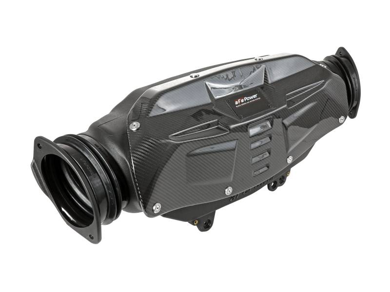 Dual 4” Flange 360-degree radial flow air filters feature our pre-oiled Pro 5R media with five layers of progressively finer cotton gauze media for maximum performance. They provide your engine with the largest amount of high-flowing air, and in most cases deliver the highest power gains of our filter media options. This media is perfect for street and/or track use. Their inverted tops make for more filter surface area, resulting in longer service intervals. Lightweight twill weave carbon fiber tube directs the filtered air from the dual air filters to the engine. It is computer designed and dyno tested to increase air flow while reducing weight and enhancing the visual appearance of the engine bay. The tube is manufactured out of 100% carbon fiber material (No fiberglass). The dual air filters are surrounded by an open-element XLPE (cross-linked polyethylene) polymer housing that minimizes warm engine air for maximum performance. It is precisely designed and manufactured to fit perfectly into the factory mounting location. The housing connects to the factory air inlets on each side of the vehicle to capture the coolest air available. Silicone bellow couplings are used for engine movement and easy installation. This unique carbon fiber cover is also lightweight high gloss clear-coated twill weave carbon fiber and closes off the housing from unwanted hot engine air. It features a Black Series emblem for authenticity and is secured to the housing using aFe POWER laser etched washers and bolts. This cover will greatly enhance your engine bay appearance. Premium stainless steel clamps and flexible silicone couplings are used for strength and durability while also providing the most secure installation available.
