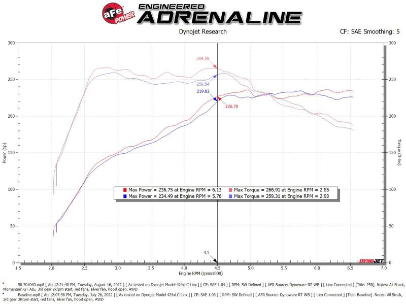 This aFe POWER Pro 5R air filter is a 7-1/2” tall, pre-oiled, 360-degree radial flow performance air filter with five layers of progressively finer cotton gauze media for maximum performance. It provides your engine with the largest amount of high-flowing air, usually resulting in the highest power gains out of all our filter media options. This media is perfect for street and/or track use. The sealed XLPE polymer housing features a rugged design, as well as a clear sight window, allowing for hassle-free filter inspection. aFe POWER's patent pending filter-to-housing interface eliminates the use of an overabundance of parts, further simplifying the installation process. The housing utilizes the factory air inlet, using no additional hardware, and features an optional auxiliary air inlet that pulls in additional air. This system features a high quality, computer-designed, dyno-tuned intake tube to achieve maximum power gains while maintaining a perfect fit. Its XLPE material is heat soak resistant and extremely durable. The computer designed system utilizes factory mounting locations, minimizing the use of unnecessary hardware and ensuring a perfect fit every time. Its innovative design makes for a hassle-free, direct bolt-on installation process that requires no cutting or drilling. Its revolutionary design, featuring our patent pending filter-to-housing interface, uses half the number of parts of a traditional cold air intake system.