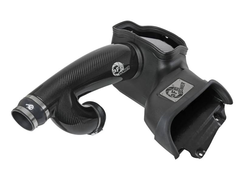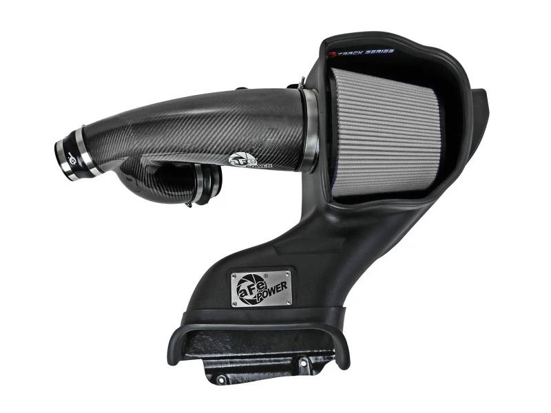 aFe POWER Track Series Intake Systems, the pinnacle of innovation in open-element intakes. Showcasing a one-piece housing that shields from elements and heat, seamlessly fitting into the engine bay. The highlight of the Track Series is its carbon fiber intake tube, meticulously CAD-designed and refined through dyno-testing. The result is a visually striking, lightweight system that delivers exceptional performance and a captivating induction sound. This 9” tall 360-degree radial flow air filter features a 5-1/2" flange and our oil-free Pro DRY S media with three layers of synthetic media for maximum convenience. Its progressive layering provides great filtration efficiency and dust holding capacity, while not requiring the use of oils. This media is best suited for street use. Its inverted top makes for more filter surface area, resulting in longer service intervals. The included massive air filter is surrounded by an open-element XLPE (Cross-linked Polyethylene) polymer housing that minimizes warm engine air for maximum performance. Its open design allows for easy viewing of the air filter, and an aggressive air intake sound. The built-in air intake scoop captures cold air directly from the top of the radiator support thanks to its huge opening. The lightweight tube is computer-designed to achieve maximum power gains while maintaining a perfect fit. Manufactured from 100% twill weave carbon fiber, it features zero fiberglass and is clear-coated for the highest quality construction. The computer designed system utilizes factory mounting locations, minimizing the use of unnecessary hardware and ensuring a perfect fit every time. Its innovative design makes for a hassle-free, direct bolt-on installation process that requires no cutting or drilling. Stainless-steel clamps are included for strength, and premium silicone couplers allow for ample flexibility.