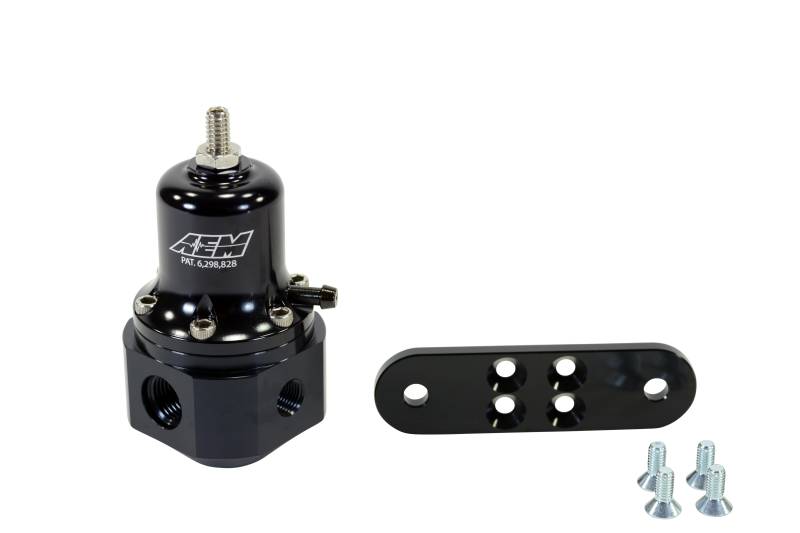 AEM High Capacity Universal Adjustable Fuel Pressure Regulator. Black Anodized. Inlet: 2 X -6 (9/16-18) Outlet: -6 (9/16"-18), Gauge Port: 1/8"NPT, Vacuum Hose: 5mm (3/16"), and Universal Mounting Bracket with Four (4) 10-32x1/2" Screws. Barb fitting for Outlet port sold separately PN 25-390.AEM's High Cap Universal Adjustable Fuel Pressure Regulator (PN 25-305BK) is the perfect solution for racers who need reliable fuel pressure in high-boost vehicles and racecars that require a large volume of fuel delivery. A longer spring provides for a wider range of adjustment (from 40 to 130 PSI). An easy-to-adjust set screw stands up to repeated adjustments.A single large return orifice is designed to handle high rate flow pumps. The regulator has a 1:1 rising pressure rate for boosted applications, and it is alcohol fuel and race fuel compatible. The High Cap Universal FPR is tapped to accept a 9/16"-18 O-Ring sealed fittings for inlet and return, and includes a 1/8 NPT port for a fuel pressure gauge or pressure sensor pick up.