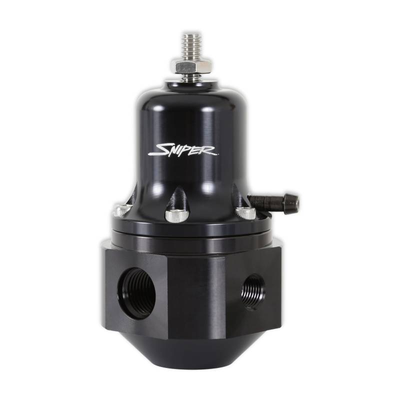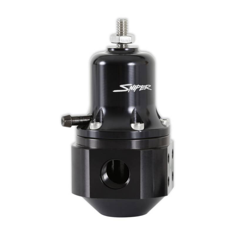 Sniper EFI universal bypass fuel pressure regulators are for use with fuel systems in street or track applications. They feature adjustable base pressure from 40-130 psi, a gauge port, and a boost reference port as well. These regulators are ideal for vehicles/systems where superior flow and pressure control are needed. These regulators are precision machined from 6061-T6 billet aluminum for strength and durability. They feature a black bright dip anodized body and a clear bright dip anodized top for corrosion resistance and good looks.