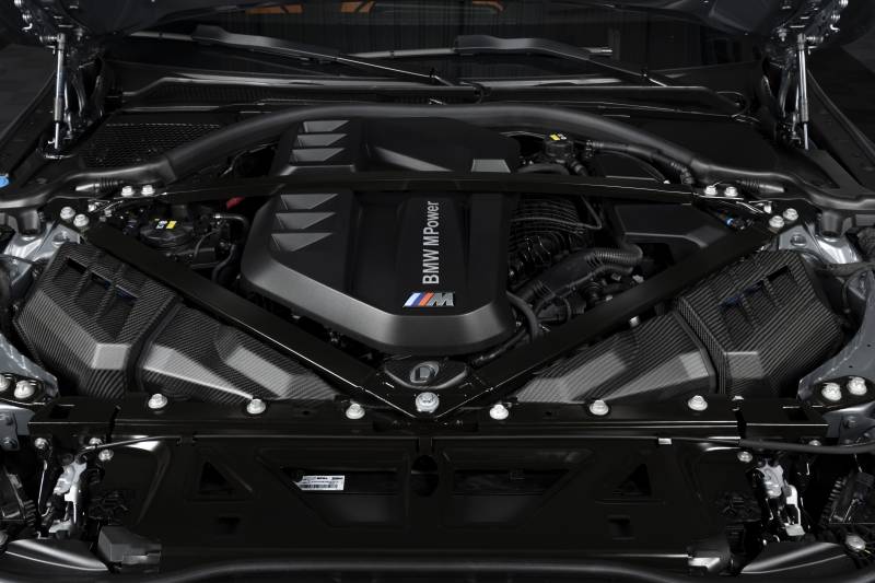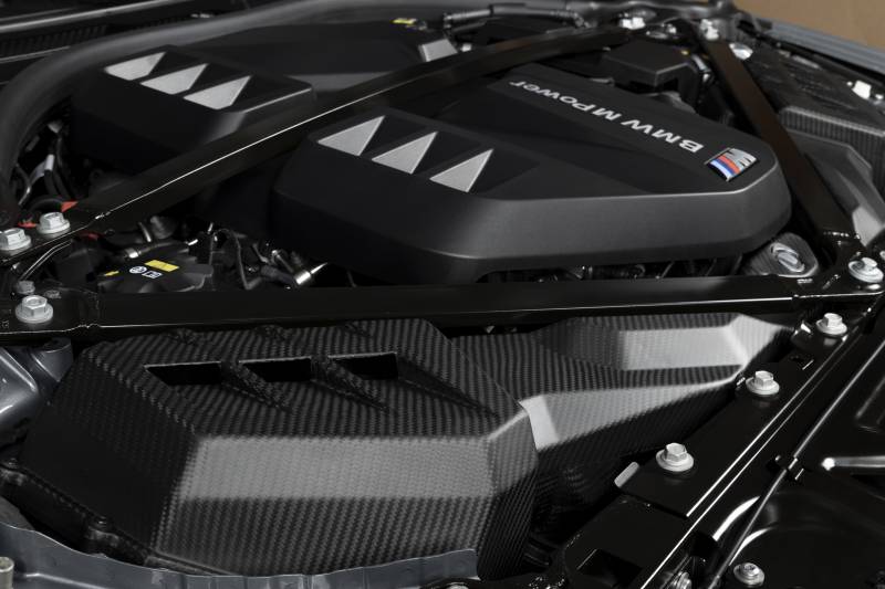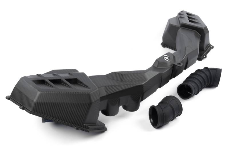 With the most potent BMW inline-6 to date, the S58, the newest iteration of the M3 has set itself apart from its predecessors; given the option for AWD, a model first, the M3 breaks boundaries long maintained by the quintessential brand icon. Being the signature chassis Dinan modifies, development on the G8x needed to similarly raise the bar and distinguish itself from the pack; a difficult task but one we relished the opportunity to embark upon. After months of comprehensive design and validation, that journey has come to its conclusion for the first of those ambitious aspirations - the Dinan G8x Carbon Fiber Cold Air Intake.\nEqual parts function, sound, and beauty, the intake not only looks and sounds the part of something special but performs the part as well. With a 12% increase in airflow to the engine without any negative effects on inlet temperatures or pressure, the Dinan G8x system delivers on all fronts. Drawing in more unimpeded air for consumption yields more efficient turbos (less work to make the same power) with the capacity for greater power potential on modified builds. Central to the design and our obsessive-compulsive need for a symmetrical engine bay is a singular plenum that replaces the separated driver and passenger intake ducting on the stock setup. The combination of the two tracks into one enlarged and distinctive shared pathway allows 50% more volume to be achieved in this tight space in addition to simplifying the installation and improving the overall look. The center plenum gives way to enlarged airboxes that house 11% larger cotton air filters delivering superb filtration while maximizing flow. Feeding the filters are the factory grill inlets as well as additional cutouts on the top of each airbox lid. The semi-open design was analyzed extensively to ensure that these additional inlets had no ill effect on temperatures or flow. However, the secondary airbox passages do allow an avenue for the induction soundtrack to escape the confines of its former plastic prison for everyone's benefit. Whether under hard acceleration, deceleration, or just spooling the amplified sounds are sure to make an impression.\nBeyond improvements to flow and sound, the appearance of the Dinan G8x M2/M3/M4 intake system is unrivaled. One need not do more than take a casual glance to know that care was taken with the system to blend in naturally with the factory engine bay while sufficiently augmenting it to a tier above. Playing off the hard angular edges that are present throughout, the Dinan intake system carefully takes these queues and carries them throughout for a true OEM+ look and feel. A 2x2 twill carbon fiber weave is used throughout and available in either gloss or matte - a first for Dinan, further setting the intake apart from those that came before.