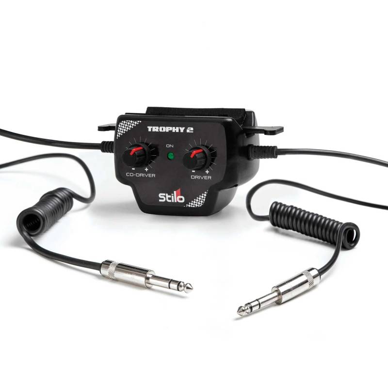 Introducing the Stilo Trophy 2 intercom, meticulously crafted for use with our Trophy Rally Des helmet and Trophy headsets. Engineered for durability and affordability, it's perfect for clubmen and Group N rally cars. Featuring individual volume controls for driver and co-driver, it ensures improved sound quality. Designed for easy mounting onto the roll bar, it offers convenience and practicality on the track. Powered by a 9-volt battery (not included), with an optional 12-volt adaptor for car power supply. Please note, it's not compatible with Trophy Plus, WRC, or ST5 helmets. Specifically tailored for Des Trophy Rally and Venti Trophy Rally helmets, it's your reliable companion for rally communication.