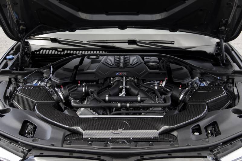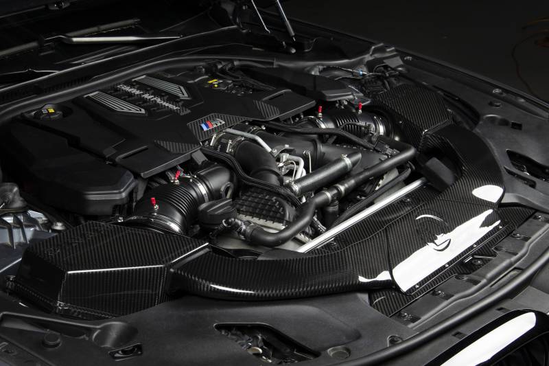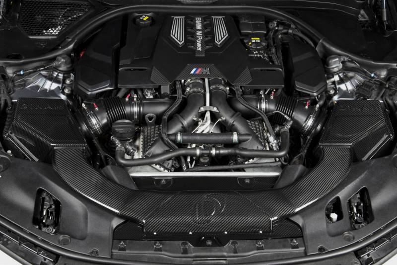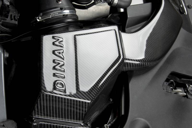 The M5 is the flagship of the marque and as such deserves to showcase the best possible components. The Dinan Carbon Fiber Cold Air intake for the latest generation of M5 holds true to that philosophy and offers arguably the best performing and most efficient sealed intake solution on the market. Quite possibly the most visually impressive as well.\nThe first thing noticed upon gazing upon the engine bay equipped with the Dinan intake is the sheer amount of gloss UV coated 2x2 carbon fiber. Stretching from one end of the engine compartment to the other, courtesy of a fully functional secondary air inlet wishbone, the material is not only beautiful to look at but serves the purpose of heat deflection as well. The wishbone, which mimics the equally impressive calling card of the F8x M3/M4 engine compartment, is purposeful in a different way. Instead of adding structural integrity, the wishbone serves as the conduit for a secondary air source deriving its contents from a central hood scoop located behind the front grilles. The additional air flow supplements the factory inlet locations on both the left and right air boxes with ambient air from outside of the engine compartment. These air boxes have been enlarged and equipped with massive filters to handle this increased volume and together with the rest of the system allow the intake to flow as efficiently as possible.\nWhile the stock intake system is adequately suited to support up to stage 1 power levels that does not mean there is no performance benefit when upgrading to the Dinan system. Besides its amazing appearance the biggest advantage of the system, by virtue of additional and optimized flow, is the reduction of the pressure depression in the stock system. This equates to the turbo having to work less in order to achieve targeted power. With the turbo working more efficiently this also means a lower pre-turbine backpressure, lower turbocharger shaft speeds, lower turbocharger compressor discharge temperatures, and for the ability to achieve higher boost pressure levels. Coupled with the optional Dinan Turbo Inlets these effects are even more exacerbated and represent ideal optimum flow and efficiency. Paired with the natural improvement to throttle response, a minor bump to the acoustics, and a visual appeal that will leave anyone speechless the Dinan F90 M5 carbon fiber intake system is a perfect complement to the "best."
