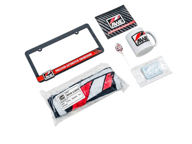 This box has everything you need to rep your favorite aftermarket brand (that's AWE, btw). Here's the scoop: This box comes complete with the AWE License Plate Frame, the AWE Tee in your size, the AWE Performance Coffee Mug, AWE Small Window Decals, and maybe some special stuff if we're in the mood. it's a great starter pack to go with your AWE parts, because who doesn't want to rep the Best Sounding Exhausts on the Planet?