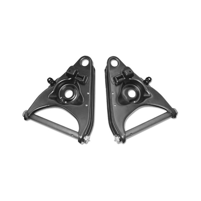 Complete lower control arm set with black powder coated finish with new cross shafts and bushings installed. Great for converting from 3/4 ton trucks to 1/2 ton for a disc brake conversion. Also great for replacing damaged originals on 1/2 ton trucks. Lower ball joint not included.