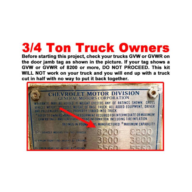 BROTHERS is proud to announce the release of our highly anticipated long bed to short bed conversion kit. This kit takes all the confusion out of this conversion and will provide you with all the necessary provisions to complete this popular conversion. The kit includes a laser-etched steel templates, high strength steel inner "C" channel braces, a new short bed front-to-rear brake line, new short bed parking brake cables and all necessary hardware to install the kit, along with highly detailed instructions. By purchasing this conversion kit, you will have everything needed to shorten your long bed frame with basic hand tools in your own garage. Does requires welding to finish the conversion but with our steel inner braces, you will be able to safely transport the vehicle to a certified welder - if needed. A short bed gas tank is required. The driveshaft will also have to be shortened before re-installation. Note: For 3/4 ton truck owners you will need to check your trucks GVW or GVWR on the door jamb tag. If your tag shows a GVW or GVWR of 8200 or more, DO NOT PROCEED. This kit WILL NOT work on your truck.