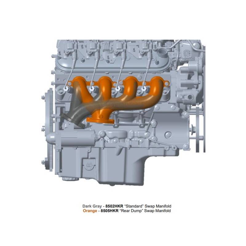 For applications or projects where our standard LS swap manifolds (8501HKR, 8502HKR, 8503HKR series) don't quite fit and our "center dump" manifold (8504HKR) exits too far forward, our new "rear dump" cast iron swap manifolds have arrived. These differ in that they exit in a straight-down fashion much like a block hugger header but exit more toward the rear of the engine than our "center dump" manifolds. Cast out of the same Hi-Silicon-Moly Ductile Iron as most of our other lines, it will be tough to find a more durable, streamlined, and quiet exhaust option. Available in natural cast, silver ceramic, or black ceramic finishes, these manifolds are offered with flanges, gaskets, and flange hardware for connecting to our lineup of adapter pipe kits. This not only allows for the easy addition of catalytic converters but also makes it'simple to connect to our many exhaust system options.