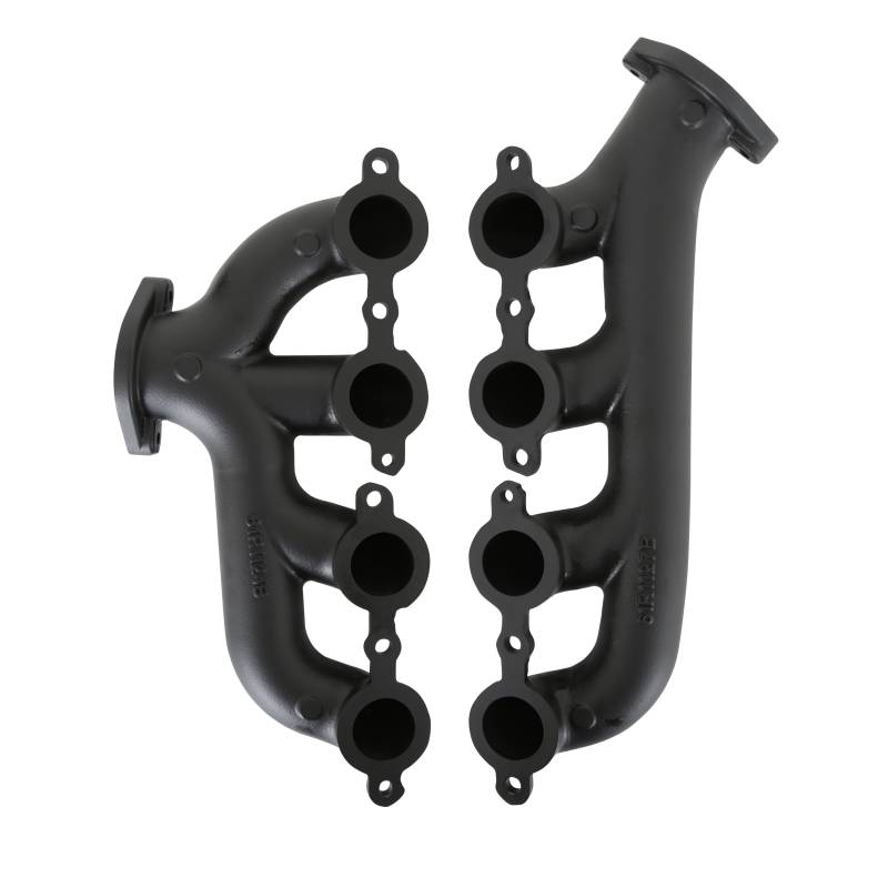 For applications or projects where our standard LS swap manifolds (8501HKR, 8502HKR, 8503HKR series) don't quite fit and our "center dump" manifold (8504HKR) exits too far forward, our new rear dump and rear dump SBC exit cast iron swap manifolds have arrived. These differ in that they exit in a straight-down fashion much like a block hugger header but exit more toward the rear of the engine than our "center dump" manifolds.\nWhile almost the same as our 8505HKR line, the 8506HKR line shares the same driver side manifold, but has the passenger side exit of traditional Small Block Chevrolet manifolds (see 8525HKR) to guarantee fitment and possibly bolt up your existing exhaust when doing an LS swap. Cast out of the same Hi-Silicon-Moly Ductile Iron as most of our other lines, it will be tough to find a more durable, streamlined, and quiet exhaust option. Available in natural cast, silver ceramic, or black ceramic finishes, these manifolds are offered with flanges, gaskets, and flange hardware for connecting to our lineup of adapter pipe kits or for ease in fabricating your own custom exhaust.