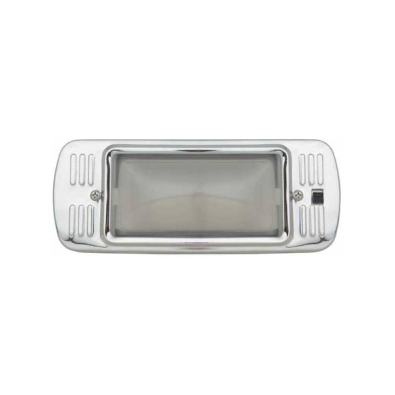 Reproduction dome light assembly with chromed metal housing, glass lens, switch for lamp, and bulb. Comes fully assembled and ready to install.