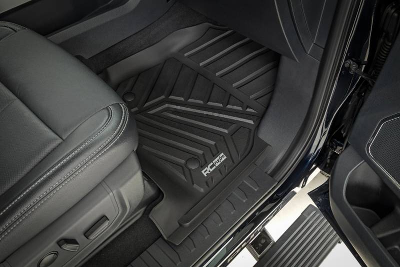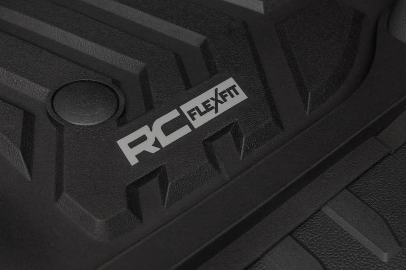 Introducing Flex-Fit floor mats ΓÇö the ultimate enhancement for your truck's interior and built tough to handle any challenge. Crafted from premium rubber-like material, these mats are as durable as they come, perfectly tailored to fit your truck's unique shape for a seamless finish.\ Stock floor mats just don't cut it for adventurers. They get trashed by mud, don't hold up to spills, and leave your carpets a mess. Give your ride the all-weather protection it deserves with Rough Country's Flex-Fit Floor Mats, the perfect solution for keeping your vehicle clean and protected.\ All-Weather Protection: Engineered to fit your vehicle perfectly, these mats provide top-notch defense against snow, mud, sand, saltwater, and more.\ Spill Saver Lip: Don't sweat the spills! Our mats feature a Spill Saver Lip that prevents liquids from reaching your carpet, so you can enjoy your coffee on the go without worry.\ Non-Slip, Textured Surface: Stay in control no matter the terrain with our mats' non-slip, textured surface, designed to keep your feet firmly planted while driving.\ Easy to Clean and Maintain: Cleaning up is a breeze! These mats are detachable and easy to clean, so you can spend less time on maintenance and more time hitting the road.\ Premium Materials: Constructed from a rubber-like TPE material, these mats are built to withstand extreme temperatures without cracking or warping. They will stay flexible and functional for the long haul.\ Effortless Installation: Forget wrestling with bulky mats. Flex-Fit Mats slide right into place for a quick and frustration-free installation.\ Upgrade your truck's defense against the elements with Rough Country's Flex-Fit Floor Mats. They'll keep your carpets looking fresh and give you peace of mind on every adventure.