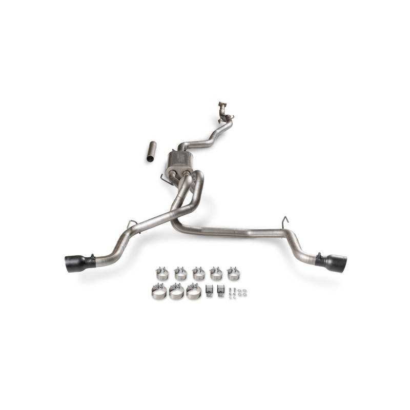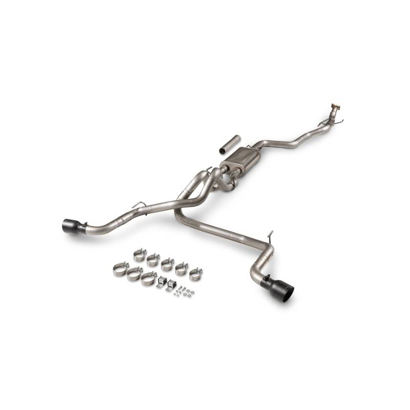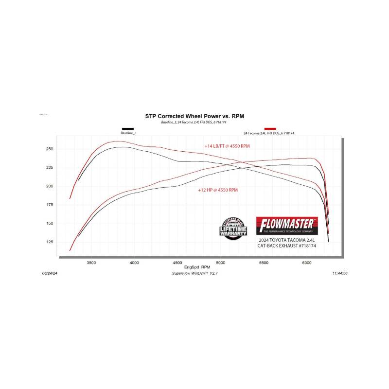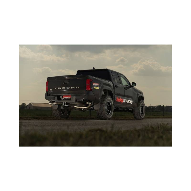 Flowmaster's® Flow FX Cat-back exhaust system is for the 2024-2026 Toyota Tacoma with the 2.4-liter engine. This performance exhaust system fits both 2/4 Wheel drive models and is manufactured from 409 stainless steel for years of trouble-free service and performance. Features include a 3.00-inch inlet pipe leading into a 409 stainless steel Flow FX series "straight-through" muffler for great sound and maximum performance. The dual 2.5-inch mandrel-bent tailpipes exit out behind rear tires and are finished off with a large 4.0-inch diameter black ceramic coated 304S stainless steel tips, giving your Tacoma that custom look and better ground clearance than the stock tailpipe. Max dyno gains of 12 hp and 14 lb-ft at the rear wheels. The system uses all the factory hanger locations and connections for an easy installation that you can do at home. Includes installation instructions and all necessary hardware. Backed by Flowmaster's Lifetime Limited Warranty.