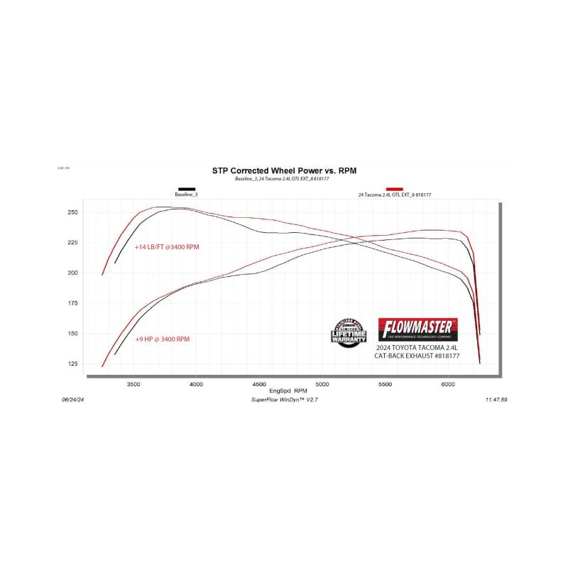This Flowmaster® Outlaw Extreme cat-back exhaust system for the 2024-2026 Toyota Tacoma with the 2.4-liter engine is manufactured using durable 409 stainless steel throughout and features 3.0-inch mandrel bent pipes for better exhaust gas flow. A race inspired Outlaw series muffler is used for maximum performance and delivers an aggressive sound inside and out. This system exits under the truck with a dump style turn down tip for added style and better ground clearance when driving off-road. Max dyno gains of 9 hp and 14 lb-ft at the rear wheels. The system uses all the existing factory hanger locations and includes installation instructions and all necessary hardware for an easy installation that you can do at home. Backed by Flowmaster’s Lifetime Limited Warranty.