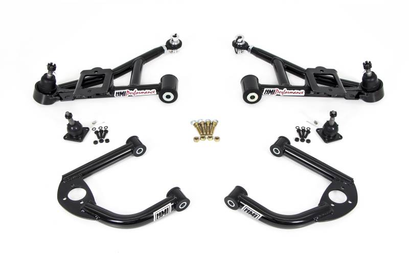 UMI’s fabricated tubular a-arms provide a rock solid foundation for your 4th Gen’s front suspension. Our a-arm kit is built to offer increased rigidity, smooth travel, a precise steering feel, and an 8lb weight savings over stock. The DOM 1-1/4” diameter tubular sections are precision bent, CNC notched and welded in a jig to form the solid base. The in-house built 4130 CrMo tube adapter on the lower a-arm provides a durable attachment point for the precision rod-end while the other side features a smooth, quiet bind free polyurethane bushing. The lower a-arms feature UMI’s new bind free bushing end that uses a two piece heavy duty sleeve that allows the a-arm to pivot freely while the upper a-arms use street friendly greasebale polyurethane bushings. The unique combination of precision and comfort makes for a great street oriented a-arm kit with racing tendencies. The spring and shock attach to the lower arm via a tough 1/4” thick steel shock mount. The CNC machined lower ball joint cup and CNC laser cut upper pad feature premium ball joints installed. UMI’s tubular lower a-arms can be installed on the factory k-member or any aftermarket k-member as well as the stock spindle - making this a true bolt-on product. Manufactured with pride in Philipsburg, PA – USA\nHardware kit P/N 2303 - A-arm hardware kit includes Grade 10.9 bolts, washers and Ny-lock nuts. Kit includes everything needed to mount your new UMI a-arms to the vehicle.\nCrMo - CrMo version uses 1-1/4” 4130 CrMo tubing, maintaining strength and reducing product weight by an additional 2lbs giving a total weight reduction of 10lbs. P/N 230511CM.\nFeatures:\n1-1/4” USA mild steel DOM tubing\nTIG Welded 4130 CrMo threaded tube adapters for thread durability\nCNC machined lower ball joint cup\nHeavy duty CNC laser cut ¼” thick shock mount\nPremium upper and lower ball joints installed\n¾” Teflon lined, high load capacity race rod ends\nGreaseable polyurethane bushings\nHigh grade shock mounting hardware included\nUses balance of OEM hardware or use new UMI hardware kit\nDurable red or black powder coat\nMade in Philipsburg, PA – USA