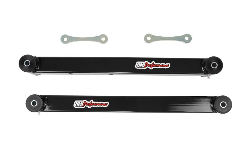 UMI’s extended length trailing arms optimize wheelbase to improve the appearance of the wheel in the wheel opening. Heavy boxed tubing and high quality polyurethane greaseable bushings make our extended length trailing arms a great upgrade to your ride. We recommend using extended length upper arms such as UMI 3619, 3620 or 3624.\n**Features**\n– Built using 0.120″ Wall Thickness Rectangular Mild Steel Tubing\n• +5/8" extended length\n– CNC Machined for Precision Tolerances and Accuracy\n– MIG Welded DOM Steel Bushing Holders\n– Modern formulation greaseable poly bushings\n– Durable Long Lasting Powder UMI Red or Gloss Black Powder Coat finish
