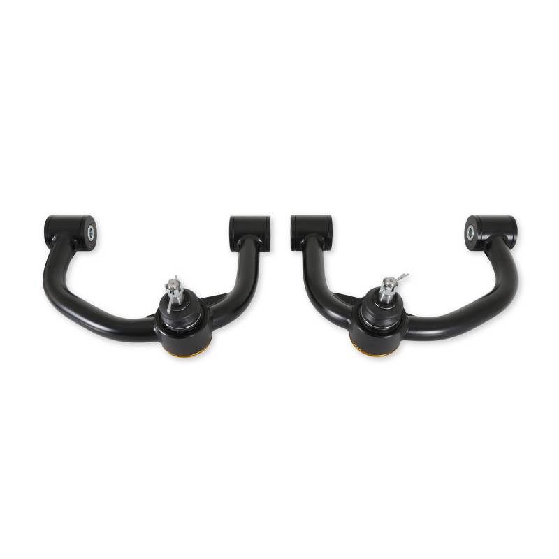 Upgrade the front of your 2004-2020 Ford F-150 with our Heavy-Duty Tubular Steel Upper Control Arms. Engineered to correct camber, caster, and accommodate lifts up to 4 inches, these control arms feature acetal copolymer bushings that provide significantly less deflection compared to stock rubber. Durability is king with a 1.250-inch OD x .188-inch wall DOM steel frame and finished with a sleek gloss black powder coat. The included ball joint dust cover, CNC machined from 6061 billet aluminum, is anodized in gold, laser engraved with the ADS logo, and protected with a clear powdercoat for UV resistance. Fully rebuildable and utilizing a standard ball joint with a rubber dust boot, this product also includes Grade 8 hardware, ensuring top-tier performance and longevity for all your off-road adventures.