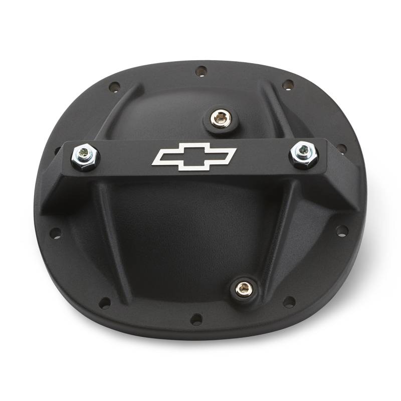 Differential Cover Reinforced lightweight aluminum rear end cover designed to strengthen the rear housing case in heavy torque situations. The familiar Bowtie Emblem is raised and precision milled on a black crinkle coated surface. Each cover includes two bolts to stabilize bearing main caps, a fluid capacity plug, a magnetic drain plug, and Grade 8 mounting bolts. Exterior of the cover has a black crinkle finish.