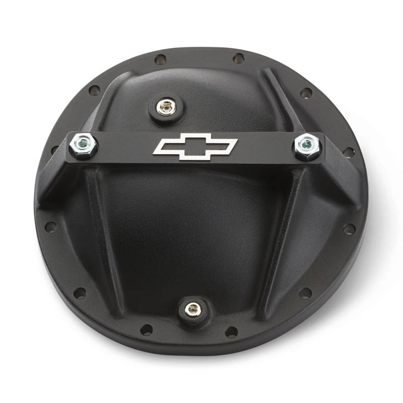 Differential Cover Reinforced lightweight aluminum rear end cover designed to strengthen the rear housing case in heavy torque situations. The familiar Bowtie Emblem is raised and precision milled on a black crinkle coated surface. Each cover includes two bolts to stabilize bearing main caps, a fluid capacity plug, a magnetic drain plug, and Grade 8 mounting bolts. Exterior of the cover has a black crinkle finish.